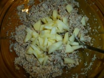 déposer des rondelles de banane(1) au fond du plat, puis des morceaux de pomme (3 ou 4) et y verser la préparation, puis 30 mn au four à 180°....hum !!!